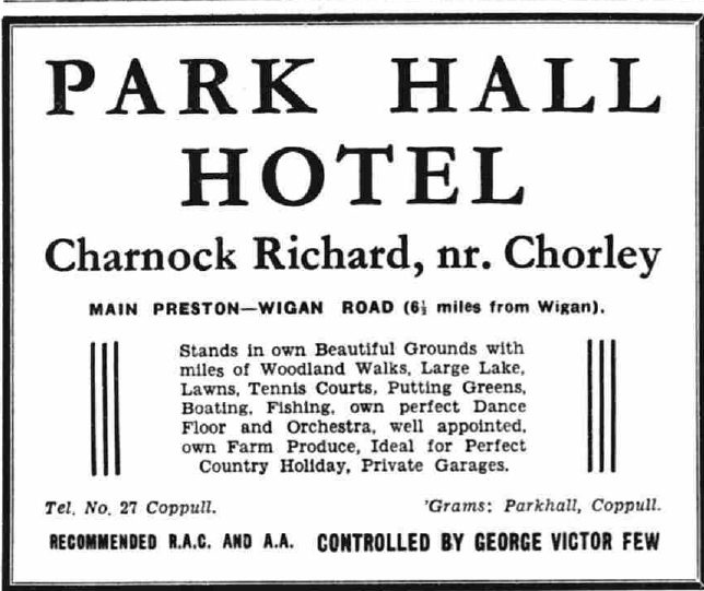 In 1934 the estate was purchased by hotelier Victor Few and the hotel was renamed the Park Hall. In 1930 Mr Few had built the Knights Court Hotel in Blackpool and in 1936 he also acquired the Gower Hotel in Euston Square (now known as the Euston Square Hotel). The produce for all three hotels was grown at Park Hall.