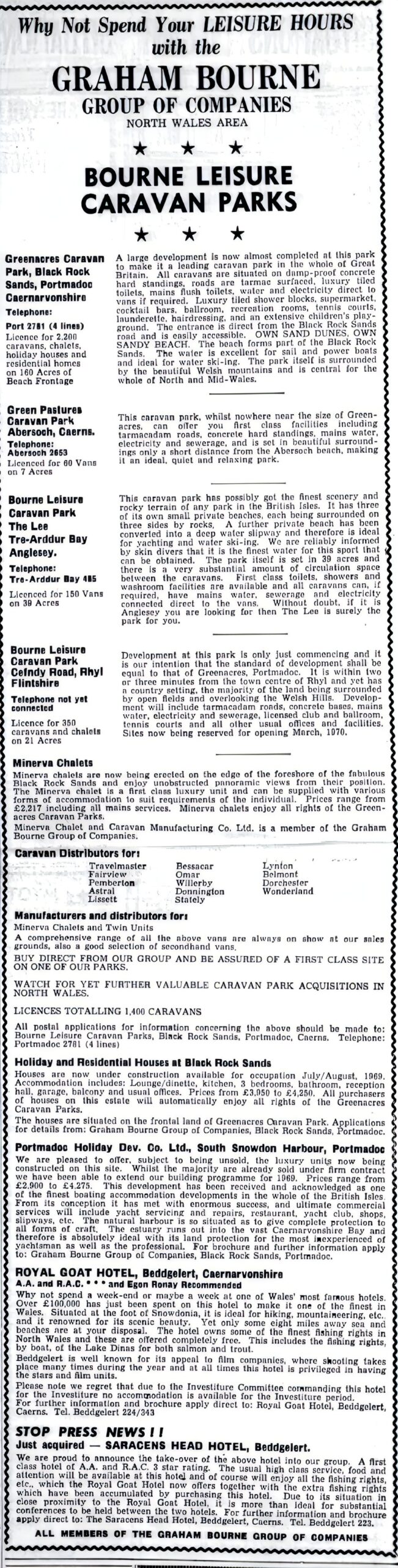 By the late 1960s Bourne had acquired three more caravan parks in North Wales, all under the Bourne Leisure name. He diversified into housing, building 64 homes beside Greenacres, and into hospitality, buying two hotels in Beddgelert. His prefab chalet company, Minerva, supplied other holiday parks, and he even launched developments in Malta and the Isle of Man.