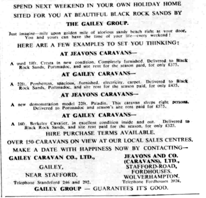In 1962 he bought a bare-bones camping/caravan park at Black Rock Sands, near Porthmadog – a site that had been welcoming campers since the 1930s. He named it Greenacres and teamed up with Wolverhampton businessman Dennis Jeavons of the Gailey Group to fill the park with new customer-owned caravans. Gailey would go on to become the largest caravan distributor in the country